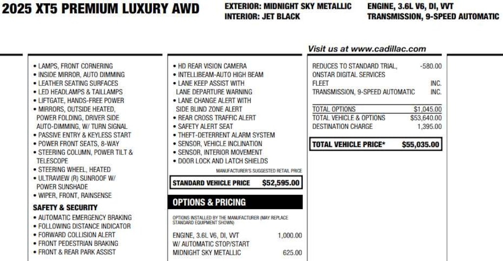 Leather Seats, Sunroof, Panoramic Roof, All Wheel Drive, Power Liftgate, Heated Driver Seat, Back-Up Camera, Premium Sound System, Satellite Radio, Onboard Communications System, Aluminum Wheels, Remote Engine Start, Dual Zone A/C, WiFi Hotspot, Hands-Free Liftgate. Rear Spoiler, Privacy Glass, Remote Trunk Release, Keyless Entry, Child Safety Locks. Cadillac AWD Premium Luxury with Midnight Sky Metallic exterior and Jet Black interior features a V6 Cylinder Engine with 310 HP at 6600 RPM*. CARFAX 1-Owner 172-Point Vehicle Inspection, including road test performed by trained Cadillac technicians, 1 year-unlimited mile Limited Warranty upon expiration of the New Vehicle Limited Warranty, $0 Deductible, All scheduled maintenance performed and up to date, Can be serviced at any Cadillac dealer nationwide, Digitally equipped vehicles are eligible for 3 trial months of OnStar Directions and Connections, 24-Hour Roadside Assistance with Courtesy Transportation, Satellite radio-equipped vehicles include a 3-month trial to SiriusXM All Access package