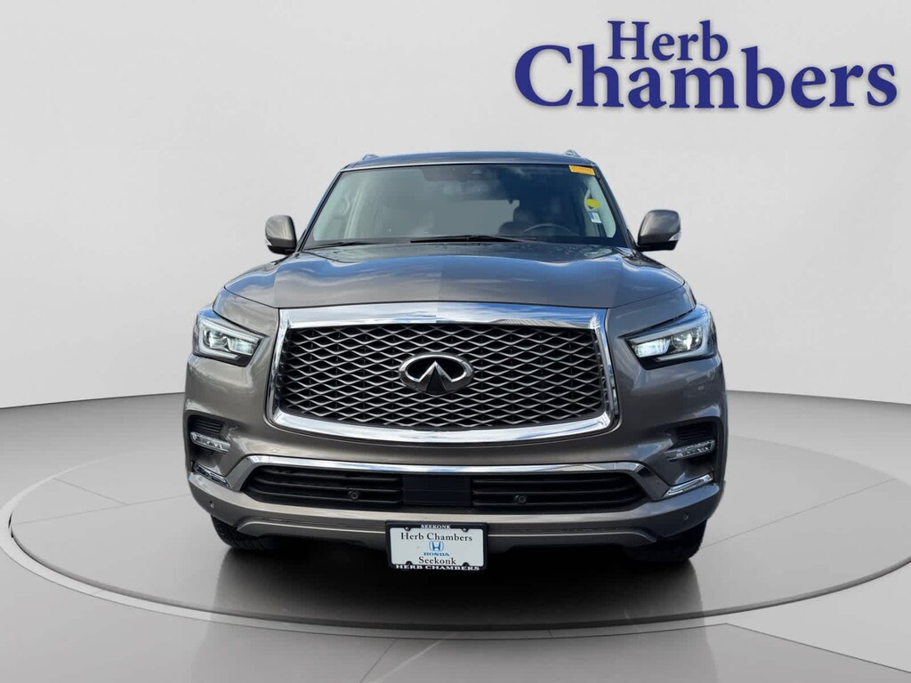 20 spare tire and alloy wheel, Wheels: 22 x 8.0 14-Spoke Forged Aluminum-Alloy, Tires: 275/50R22 H-Rated All-Season Performance, steering wheel switch for safety shield technologies, Backup Collision Intervention (BCI), Blind Spot Intervention (BSI), Lane Departure Warning (LDW), Lane Departure Prevention (LDP), Intelligent Cruise Control (Full-Speed Range), Distance Control Assist (DCA), Blind Spot Warning (BSW), wireless remote control, HDMI port, headphone jacks (x2) and USB port for audio/video input, Utilizes DVD player in front headunit, 120V Power Outlet, Wireless Headphones (2), Dual 8 Color Monitors, Factory installed, Cross bars integrate into existing roof rails for maximum utility, Wind-tunnel-tested design, Cruise Control W/Steering Wheel Controls, Smart Device Remote Engine Start, Power Door Locks W/Autolock Feature, Front Camera, Front Fog Lamps, Led Brakelights, Heated Front Bucket Seats -Inc: 10-Way Power Drivers Seat W/Dual Occupant Memory System And 8-Way Power Passengers Seat Including 2-Way Power Driver And Passenger Lumbar Support, Automatic Full-Time Four-Wheel Drive, Heated Leather/Simulated Wood Steering Wheel W/Auto Tilt-Away, Proximity Key For Doors And Push Button Start. INFINITI LUXE with Smoky Quartz exterior and Graphite interior features a 8 Cylinder Engine with 400 HP at 5800 RPM*. This QX80 is priced $900 below Kelley Blue Book.